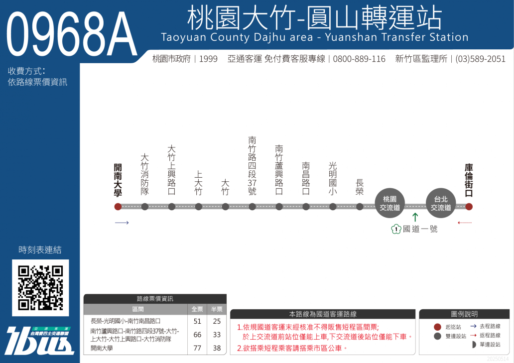 桃園大竹 ⇄ 圓山轉運站 路線圖 即時動態 路線新聞 桃園大竹 ⇄ 圓山轉運站 路線圖 本路線為國道客運路線 1.依規國道客運末經核准不得販售短程區間票; 於上交流道前站位僅能上車,下交流道後站位僅能下車。 2.欲搭乘短程乘客請搭乘市區公車. 即時動態 動態查詢 票價查詢 0968 0968A 路線新聞 近期無相關新聞 主管機關 新竹區監理所 03-5892051 請在這裡輸入標題
