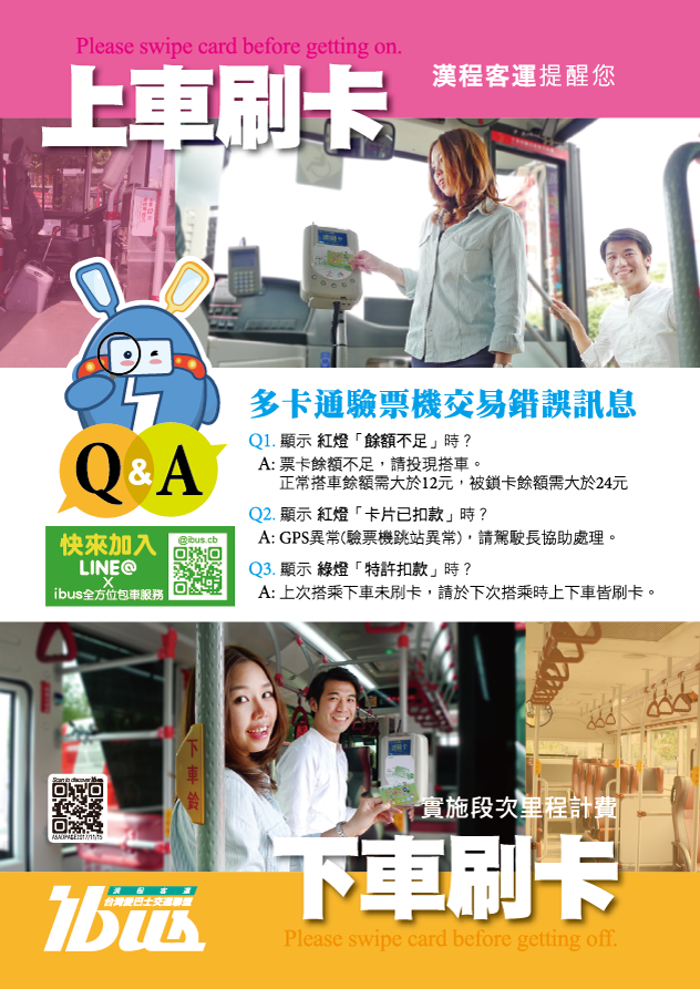 今年起為了改善公車分段收費緩衝區與段號證不便問題,已經將緩衝區取消,並且在每輛公車後車門加裝刷卡驗票機,改以乘客實際搭乘的里程距離計費,才能計算出實際距離。所以有持電子票卡的民眾朋友們,要記得「上下車皆需要刷卡」喔!
