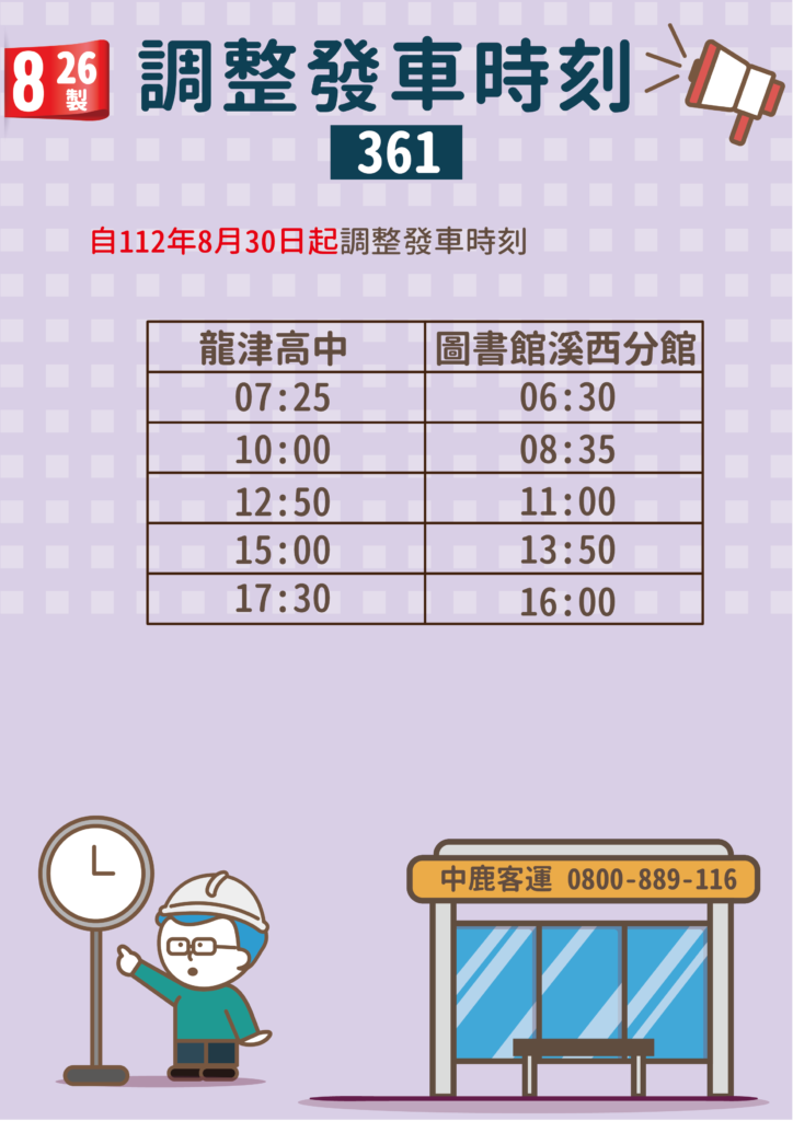 [中鹿]臺中21、40、283、361、綠1、525路時刻表調整路線資訊 / 2023-08-28 2023-08-30 調整日期:2023.08.30調整路線:21、40、283、361、綠1、525路調整內容:時刻表調整 詳細班次時刻表請參考路線專頁,如有其他路線、班次相關問題,歡迎您撥打我們的免付費客服專線 分享此文:Facebook列印