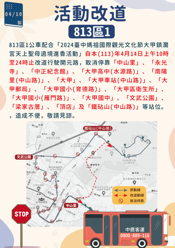 [中鹿]臺中813路配合「天上聖母遶境進香活動」道路管制通知路線資訊 / 2024-04-03 2024-04-10 調整路線:813路調整內容: 調整路線:813區1路調整內容: 調整路線:813區2路調整內容: 詳細班次時刻表請參考路線專頁,如有其他路線、班次相關問題,歡迎您撥打我們的免付費客服專線 分享此文:Facebook列印