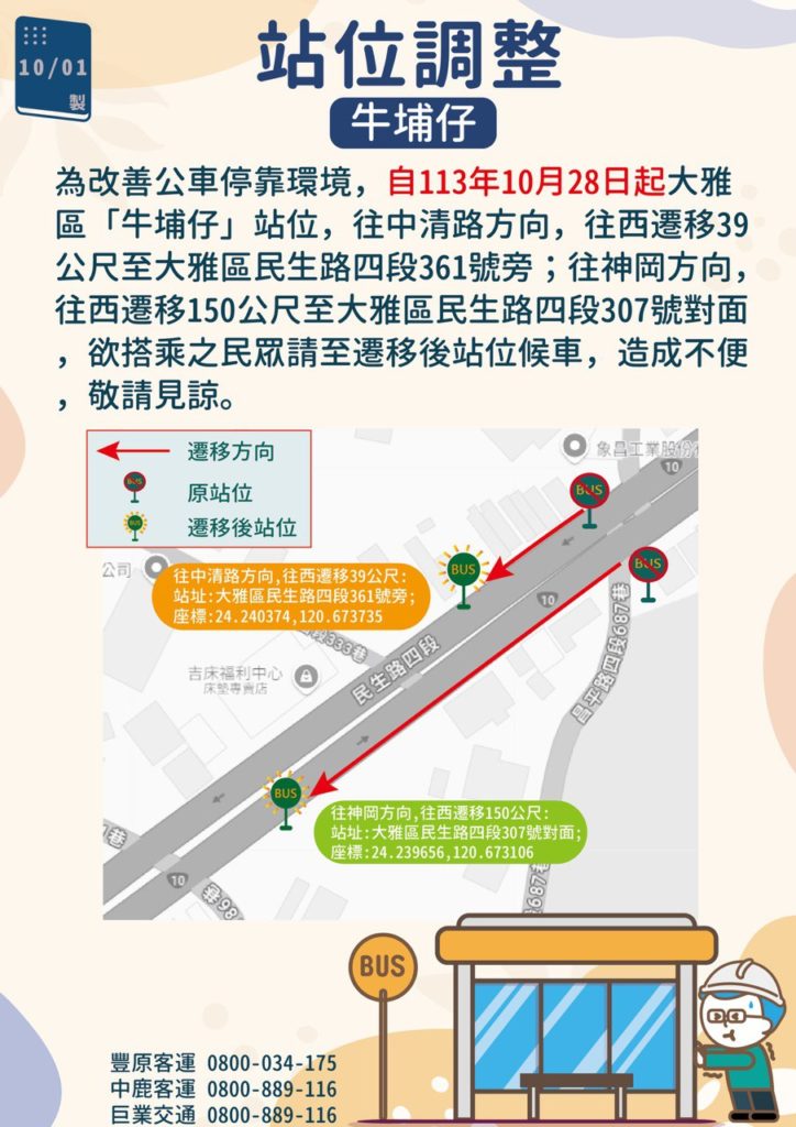 [中鹿&巨業]臺中525、528、529路「牛埔仔」站牌遷移路線資訊 / 2024-10-22 2024-10-09 調整日期:2024.10.28起調整路線:525、528、529路調整內容: 詳細班次時刻表請參考路線專頁,如有其他路線、班次相關問題,歡迎您撥打我們的免付費客服專線 分享此文:Facebook列印