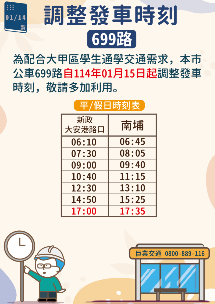 [巨業]臺中699路時刻表調整路線資訊 / 2025-01-14 2025-06-16 調整日期:2025.01.15調整路線:699路調整內容:新政大安港路口端:原16:50調整為17:00發車並南埔端:原17:25調整為17:35發車。 詳細班次時刻表請參考路線專頁,如有其他路線、班次相關問題,歡迎您撥打我們的免付費客服專線 分享此文:Facebook列印