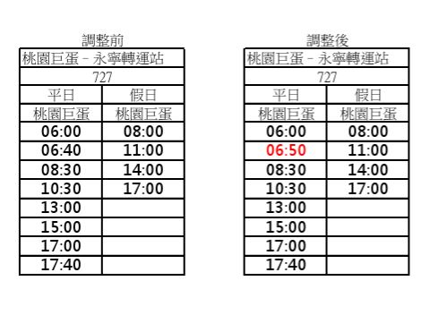 [亞通]桃園727路時刻表調整路線資訊 / 2026-01-12 2026-01-12 調整日期:2026.1.19起調整路線:727路調整內容:如下 詳細班次時刻表請參考路線專頁,如有其他路線、班次相關問題,歡迎您撥打我們的免付費客服專線 分享此文:Facebook列印