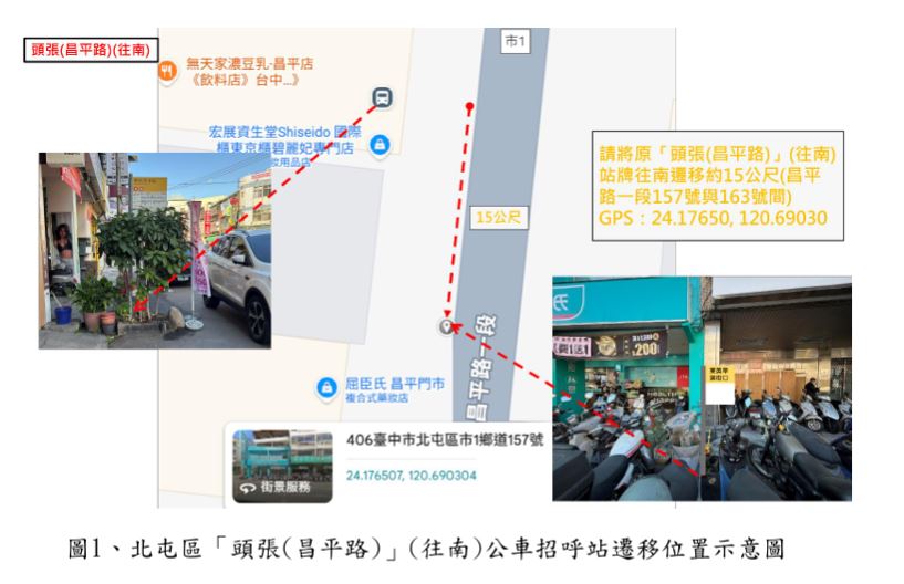 調整內容:「頭張(昌平路)」(往南) 公車招呼站由現況位置往南遷移約15公尺(本市北屯區昌平路一段157號與163號間)