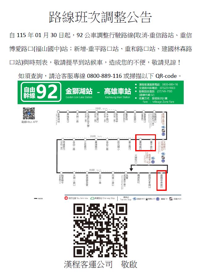 [漢程]高雄92路調整班次、新增「重平路口站、重和路口站 、建國林森路」站點、取消部分站點