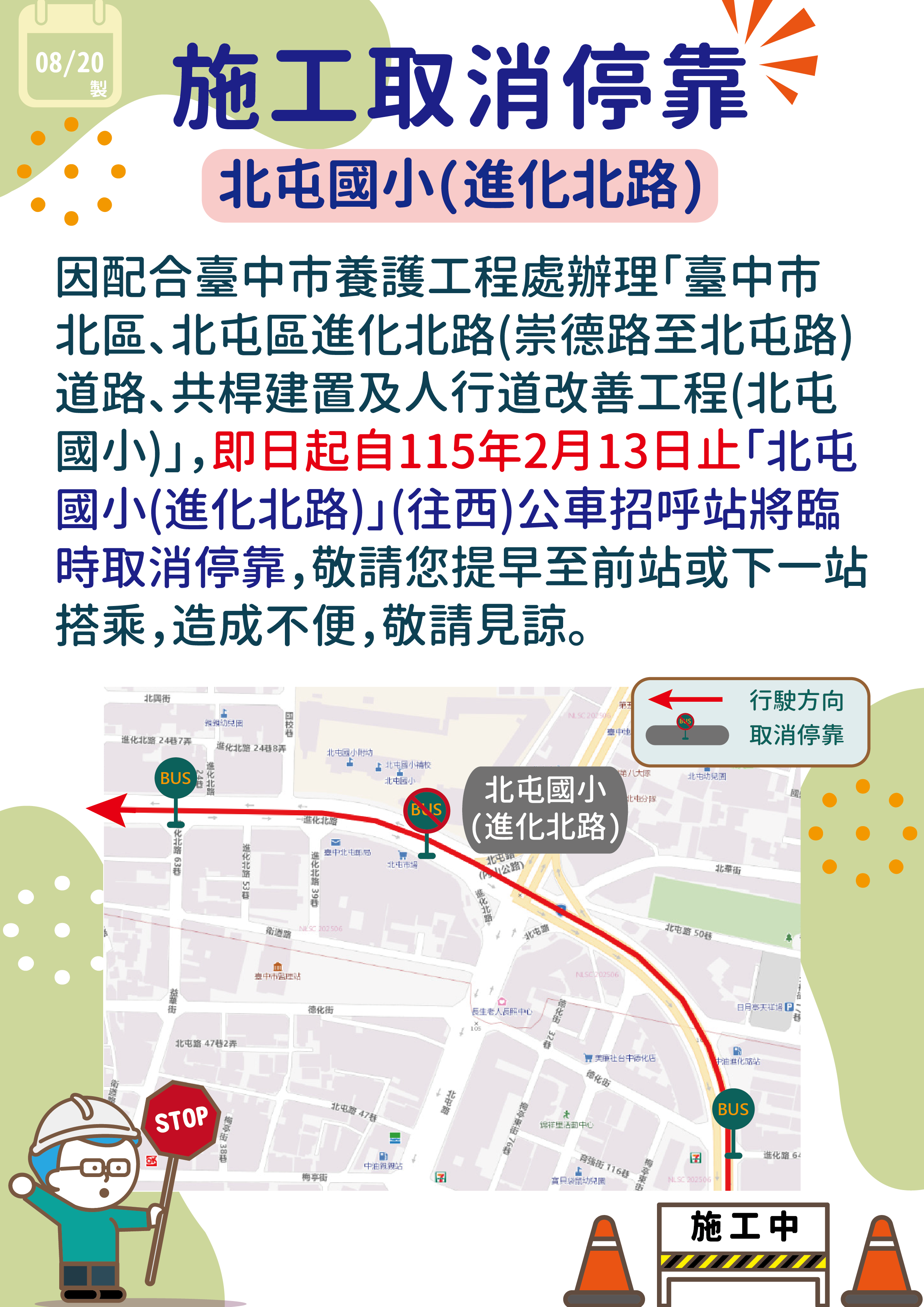 [中鹿]臺中52路、105路因施工取消停靠北屯國小(進化北路)站路線資訊 / 2026-01-21 2026-01-23 調整日期:2026.1.24 上午7:00~2026.2.2 下午6止調整路線:52(含副)、105(含延、副、區2路)影響站位:如下圖 詳細班次時刻表請參考路線專頁,如有其他路線、班次相關問題,歡迎您撥打我們的免付費客服專線 分享此文:Facebook列印
