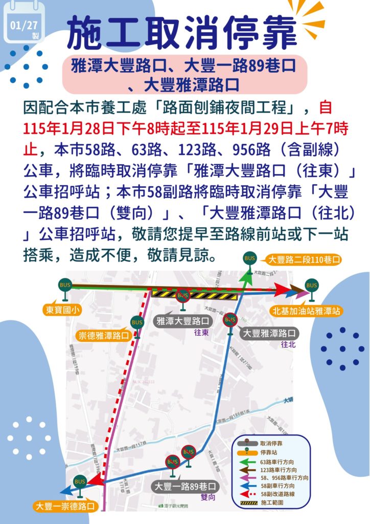 [全航/中鹿]臺中58路、123路因工程施工取消停靠「雅潭大豐路口(往東)」,58副路取消停靠「大豐一路89巷口(雙向)」、「大豐雅潭路口(往北)」路線資訊 / 2026-01-27 2026-01-27 調整日期:2026.1.28 8:00pm~2026.1.29 7:00am調整路線:58路、58副路、123路影響站位:如下圖 詳細班次時刻表請參考路線專頁,如有其他路線、班次相關問題,歡迎您撥打我們的免付費客服專線 分享此文:Facebook列印