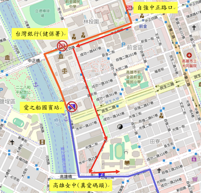 【替代站位】:乘車民眾請至「自強中正路口」、「高雄女中(真愛碼頭)」搭乘,不便之處,敬請見諒。