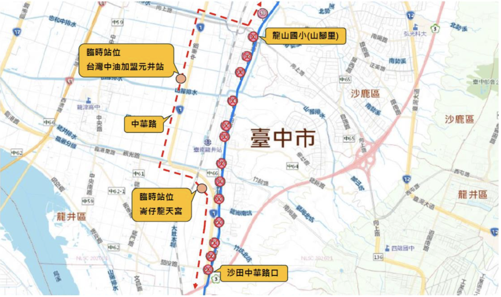 回鑾改道:龍井市區沙田路四段至六段沿路實施改道,營運路線【180沙鹿一彰化】路線調整,改行中華路屆時180路「龍山國小(山腳里)」至「沙田中華路口」暫停靠站,可於臨時站位「台灣中油加盟元井站」、「崙仔龍天宮」搭乘,不便之處,敬請見諒。