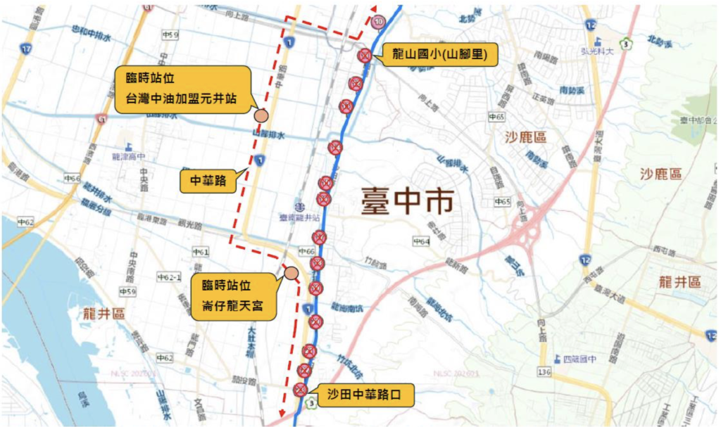 鹿龍井間沙田路四段至六段沿路實施改道,營運路線【677沙鹿龍井環線】路線調整,改行中華路屆時677路「龍山國小(山腳里)」至「竹坑口」暫停靠站,可於臨時站位「台灣中油加盟元井站」、「崙仔龍天宮」搭乘,不便之處,敬請見諒。
