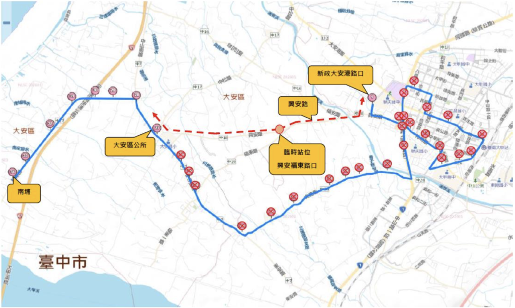 新政大安港路口」站發車後改道右轉興安路直行至大安區公所接原路線,屆時「光田」、「光田醫院(大甲院區)」、「大甲體育場」、「李綜合醫院」、「庄尾(文武路)」、「文昌祠」、「大甲車站(中山路)、「大甲」、「南陽里(中山路)」、「大甲高中(中山路)」、「南門(順天路)」、「庄美里」、「南門(光明路)」、「光田醫院(經國路)」、「順天國小」、「番仔寮(文曲路)、「文曲路506巷口」、「文曲路435巷口」、「后厝仔(文曲路)」、「誠岱機械廠」、「文武國小」、「六塊厝」、「東勢尾」「埔羌林」、「埔羌林福德祠」暫停靠站,可於臨時站位「興安福東路口」搭乘,造成不便,敬請見諒。