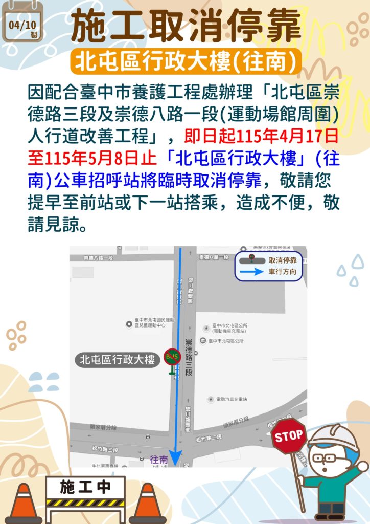 調整內容:「北屯區崇德路三段及崇德八路一段(運動場館周圍)人行道改善工程」,「北屯區行政大樓」(往南)公車招呼站將臨時取消停靠,敬請您提早至前站或下一站搭乘,造成不便,敬請見諒。