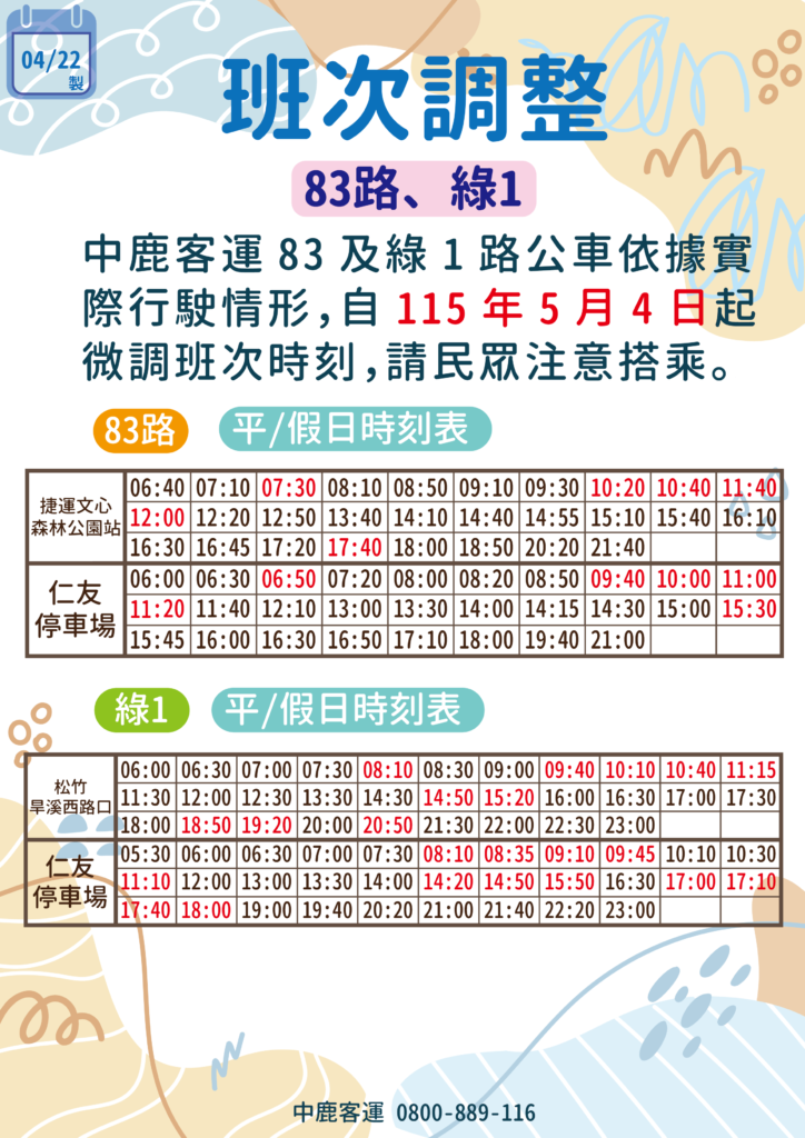 [中鹿]臺中83、綠1路,時刻表調整路線資訊 / 2026-04-27 2026-04-27 調整日期:2026.05.04調整路線:83、綠1路調整內容:微調班次時刻。 詳細班次時刻表請參考路線專頁,如有其他路線、班次相關問題,歡迎您撥打我們的免付費客服專線 分享此文:Facebook列印